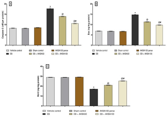 ELISA kits were used to assess caspase-3 concentrations in brain homogenate [68,69]. A brain homogenate sample were tested for Bax protein levels [70,71]. A commercial ELISA kit was used to quantify the anti-apoptotic protein Bcl-2 levels in brain homogenate [71,72] (Elabs-sciences, Wuhan, China).