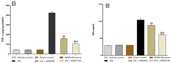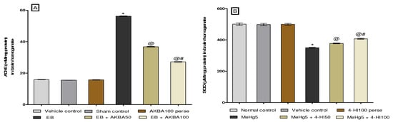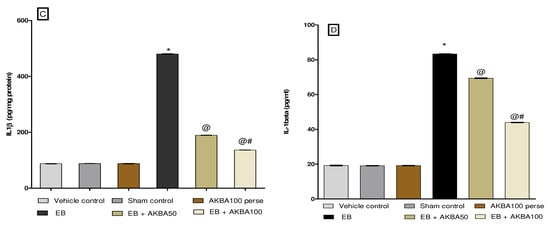 EB was obtained from Sigma-Aldrich (St. Louis, MO, USA). BAPEX, India, contributed an exgratia sample of AKBA. In addition, only analytical-grade compounds were employed in the study. Before use, the medications and chemicals were prepared in a clean, sterile environment. AKBA was dissolved in physiological saline and taken orally [36,48].