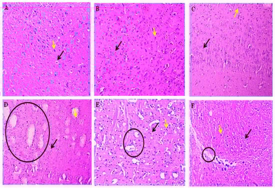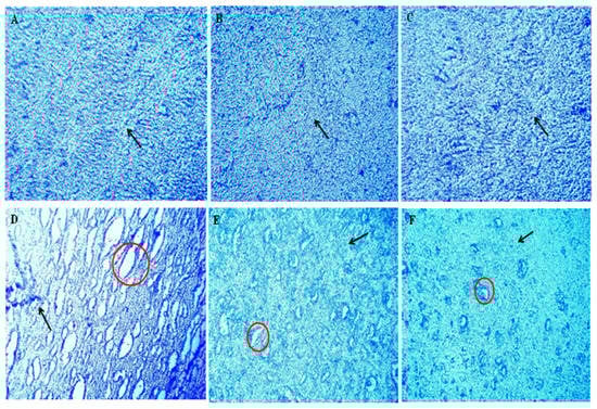 The rats were anaesthetized with sodium phenobarbital (270 mg/mL, i.p.) and sacrificed by decapitation once the experimental regimen was completed. The mid-brain was carefully removed from the entire brain for histopathological examination. Before slicing into 0.5 µm slices, the isolated area was carefully cleaned. Following fixation in 4% paraformaldehyde in PBS, pH = 7.4, overnight at room temperature, the brain was treated with different grades of ethanol. The tissue was embedded in paraffin wax and then cut into small sections. After sectioning, different washing treatments with ethanol and xylene were performed. The tissue was then stained with hematoxylin and eosin dyes and observed under a florescence microscope [90].