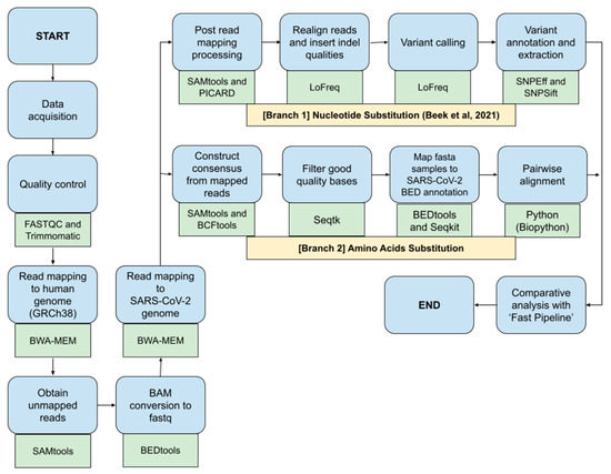 Immediately after data acquisition, quality control of NGS paired-end data was conducted by using FASTQC and Trimmomatic. Afterwards, the paired-end reads were mapped to the human genome using the BWA-MEM algorithm. Unmapped reads were obtained by using the SAMtools and were converted back to FASTQ format using Bedtools, a flexible suite for genomic analysis [11]. Acquired reads in the form of FASTQ were subjected to second read mapping to the genome of SARS-CoV-2. Subsequent SAM files generated from second read mapping were converted to BAM using SAMtools and continued by the implementation of the ‘Nucleotide Substitution’ and ‘Amino Acids Substitution’ pipeline as previously explained above. Discovered SNPs, as well as amino acid mutation, were all compared with Fast Pipeline in order to observe whether differences in pipeline application would affect the discovered SNPs and mutated amino acids.