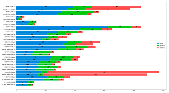 Three types of variation were annotated post-variant calling, including SNPs, insertion, and deletion. Subsequent variants derived from both pipelines were compiled, counted, and plotted in the form of a bar stack chart, as shown in Figure 3 and represented in more detail in Table 7.