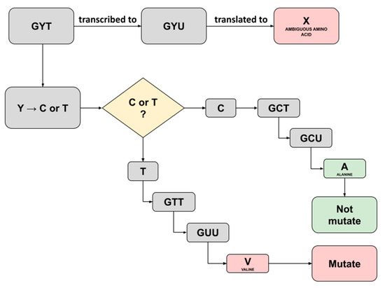 A similar investigation was conducted on the ambiguity discovered in sample F2 (position 769; NSP12-ORF1AB) running the Normal Pipeline. Traceback was utilized using the same Python script and method as those in sample C5. Figure 5 represents the flowchart how the possible translation result of ambiguous amino acid X detected in Sample F2 running in the Normal Pipeline. Eventually, it was revealed that the ‘NGC’ started prior to triplet translation to ambiguous amino acids. Uniquely, ‘N’ may be translated into any possible bases, either A, C, G, or T/U [15]. Consequently, there are four possible bases replacing the ‘N’, each with a different amino acid translation result. One of them bearing ‘S’ refers to serine amino acid is the same one designated in such a position within the SARS-CoV-2 reference sequence, and therefore, the aforementioned translation process will not alter the residue. Another possible three nucleotide substitutions, including T, C, and G, are codes for different amino acids, and as a result, a mutation occurs.