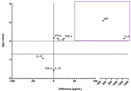 Volcano-plot of CECs’ cytokine production. Purple rectangle contains cytokines that were reliably more produced by adult bone marrow CECs.