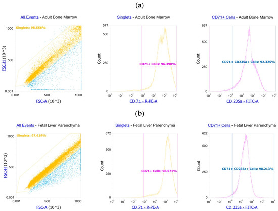 We washed the magnetically sorted cells in PBS. The following antibodies were used for staining according to the manufacturer’s protocols: anti-CD71-PE (BioLegend, 334106, San Diego, CA, USA) and anti-CD235a-FITC (BioLegend, 349104, San Diego, CA, USA). Flow cytometry showed >94% purity of the cells. The gating strategy was to isolate cells from debris, isolate singlets from the cells and measure CD71 in the singlets for both adult bone marrow and fetal liver parenchyma CECs (Scheme 1a,b).