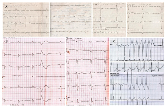 Electrocardiograms of proband. (A) (upper line)—ECG registered in 2009 (atrial fibrillation); (B) (left in the lower line)—ECG at the admission to the clinic in June 2014 (sinus bradycardia with a left axis, low QRS voltage, premature ventricular beats); (C) (right in the lower line)—24-h ECG monitoring registered in June 2014 (nonsustained ventricular tachycardia, 5 beats). Paper speed is 25 mm/s.