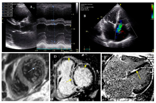 Cardiac visualization of proband. (A–C)—ultrasound cardiography. (C–E)—cardiac MRI with gadolinium. (A)—enlarged right ventricle and normal size of left ventricle; (B)—sever tricuspid regurgitation (Doppler). (C)—left ventricular noncompaction, ratio of noncompact and compact layers 3.5: 1, (D,E)—foci of late gadolinium enhancement in septum (subendocardial, intramyocardial), right ventricle and anterior wall of left ventricle (subepicardial).