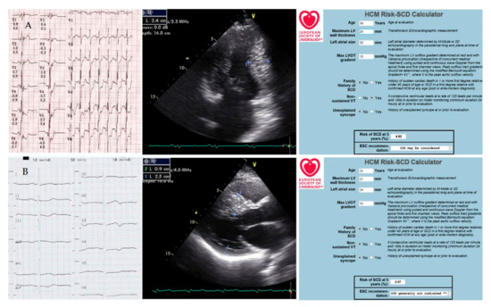 The patient’s children’s examinations ((A)—39-year-old son, (B)—35-year-old daughter). ECG (paper speed is 25 mm/s); ultrasound cardiography (measurements of interventricular septum thickness); calculation of the risk of sudden cardiac death. Explanations in the text.