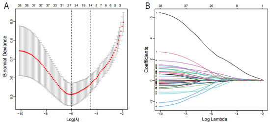 Screening of diagnostic markers via the Lasso regression. (A) Lasso coefficient distribution misclassification error. (B) Different colors correspond to various genes in the distribution of Lasso coefficients for 38 related genes.