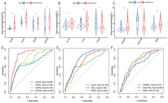Validation of diagnostic markers by internal datasets. (A–C) Validation of the expression of 10 potential biomarkers in the 141549 dataset. (D–F) Validation of the diagnostic effectiveness of 10 biomarkers in the 141549 dataset (*** p < 0.001).