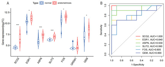 Validation of diagnostic markers by external dataset. (A) Validation of the expression of seven potential biomarkers in the 7305 dataset. (B) Verification of the diagnostic effectiveness of six biomarkers in the 7305 dataset (* p < 0.05, *** p < 0.001).