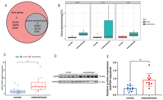 Three novel biomarkers (SCG2, ASPN, and GEM) were screened, and the findings are displayed in Figure 5A. The genes (EGR1, SLIT2, and FOS) were rejected because they were previously correlated with the development of endometriosis in the literature. The relative expression of mRNA for ASPN and GEM was found to be higher in endometriosis tissues than in normal controls by qRT-PCR (p = 0.004, p = 0.039; n = 6 vs. 6). There was no discernible difference between the two groups’ SCG2 mRNA expression (p = 0.177; n = 6 vs. 6) (Figure 5B). ASPN, the most differentially expressed gene, was selected as the target gene for our study, and the sample was further expanded to verify its transcriptional and protein-level expression. mRNA and protein expression of ASPN was found to be higher in the endometriosis group than in normal endometrial tissue (p = 0.019, n = 12 vs. 12; p = 0.0013, n = 10 vs. 10) (Figure 5C–E).