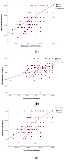 Highly significant correlation of psychological well-being, satisfaction with information, and satisfaction with outcome among all participants: previvors (blue) and survivors (red). (a) Satisfaction with outcome and satisfaction with information p = 0.000. (b) Psychosocial well-being and satisfaction with information, p = 0.000. (c) Satisfaction with outcome and psychosocial well-being, p = 0.000.