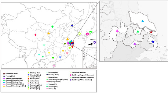 - Chen, J.; Zheng, H.; Bei, J.-X.; Sun, L.; Jia, W.; Li, T.; Zhang, F.; Seielstad, M.; Zeng, Y.-X.; Zhang, X.; et al. Genetic Structure of the Han Chinese Population Revealed by Genome-Wide SNP Variation. Am. J. Hum. Genet. 2009, 85, 775–785. [Google Scholar] [CrossRef] [PubMed]