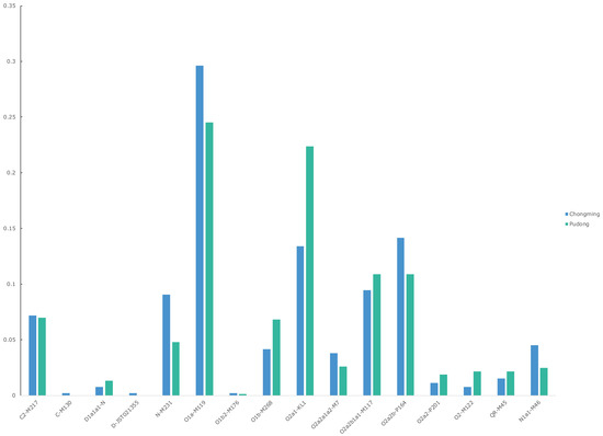 In this study, 24 Y-SNP loci were analyzed, and 18 haplogroups were defined (D, D1a1a1, C, C2, IJ, K, QR, N, N1a1, O1a, O1b, O1b2, O2, O2a1, O2a2, O2a2a1a2, O2a2b, and O2a2b1a1). The distribution of haplogroups within the Pudong and Chongming Han populations is shown in Table S7. The detailed haplogroup results of the population in the Chongming area were C2-M217 (7.17%), C-M130 (0.19%), D1a1a1-N1 (0.75%), D-JST021355 (0.19%), N-M231 (9.06%), N1a1-M46 (4.53%), O1a-M119 (29.62%), O1b2-M176 (0.19%), O1b-M268 (4.15%), O2a1-KL1 (13.4%), O2a2a1a2-M7 (3.77%), O2a2b1a1- M117 (9.43%), O2a2b-P164 (14.15%), O2a2-P201 (1.13%), O2-M122 (0.75%), and QR-M45 (1.51%). The detailed haplogroup results of the Pudong population were C2--M217 (6.97%), D1a1a1-N1 (1.31%), N-M231 (4.79%), N1a1-M46 (2.47%), O1a-M119 (24.53%), O1b2-M176 (0.15%), O1b-M268 (6.82%), O2a1-KL1 (22.35%), O2a2a1a2-M7 (2.61%), O2a2b1a1-M117 (10.89%), O2a2b-P164 (10.89%), O2a2-P201 (1.89%), O2-M122 (2.18%), and QR-M45 (2.18%) (Figure 5).