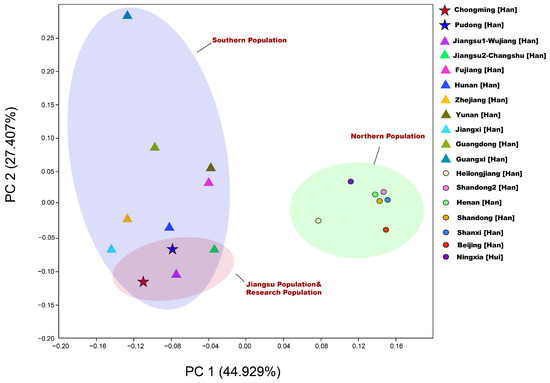 To further study the paternal genetic relationship among the populations, we integrated the haplogroup frequencies of 16 other Chinese populations for comparison. Based on the haplogroup frequencies of Pudong Han, Chongming Han, and 16 other reference populations, PCA plot was performed. The plot of the PCA was expressed in the coordinate system of the first two principal components. The results are shown in Figure 6. The first two principal components explained 72.336% of the Y chromosome variation. The first principal component clearly describes the southern population of the Chinese population (Chongming Han, Pudong Han, Jiangsu Wujiang Han, Jiangsu Changshu Han, Hunan Han, Jiangxi Han, Zhejiang Han, Fujian Han, Yunnan Han, Guangdong Han, Guangxi Han) and the geographical pattern of northern populations (Heilongjiang Han, Beijing Han, Shanxi Han, Shandong Han-1, Henan Han, Shandong Han-2, Ningxia Hui). There is an internal genetic structure in the Han population in the north and south Chinese populations [67,68].