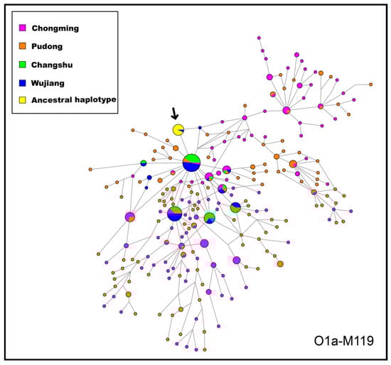 To discern the genetic structure between Pudong Han, Chongming Han and Jiangsu Han in details. We used the median joining (MJ) method to create the STR haplotype network under the O1a-M119 haplogroup. The network plot was based on 15 Y-STR loci exploring the connection and differentiation relationship of STR haplotypes under the O1a-M119 haplogroup (Figure 7). The confirmation of the ancestral haplotype of O1a-M119 is based on the 1000 Genomes Project III [70,71] Y-SNP and Y-STR datasets in Central and East Asia. The haplotype with the closest genetic distance between a haplotype and other haplotypes is calculated to define the ancestral haplogroup through EA YPredictor [72].