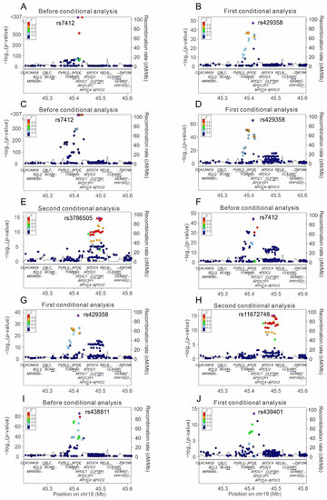 Regional association analysis for genetic variants around the APOE gene region and serum lipid levels. (A,B) For total cholesterol levels, (C–E) for LDL cholesterol levels, (F–H) for HDL cholesterol levels, and (I,J) for triglyceride levels.