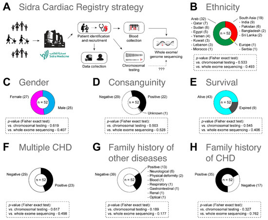 Figure 2. (A) Sidra Cardiac Registry strategy. (BH) A summary of demographic and clinical characteristics of patients with CHD (n = 52). Fisher’s exact tests were used to examine the association between obtaining a positive result in chromosomal testing or whole exome sequencing (WES) analysis and the demographic data of patients.