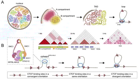 Regarding the formation of the basic three-dimensional structural loops, the “loop extrusion model” has been proposed by several groups (Figure 1B) [67,68,69]. According to the hypothesis, cohesin extrudes chromatin loops bidirectionally, and these chromatin loops will initially be small and increase over time until they are blocked by CTCF boundaries. Moreover, depending on the loop extrusion model, several modified models, including the walking model, pumping model, and scrunching model, have been proposed for the explanation of the loop extrusion process in eukaryotic mitosis cells, which improves our understanding of chromatin loop formation [70].