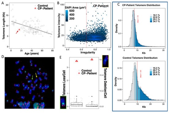 First, we used FISH with telomere-specific probes to assess telomeres in peripheral blood lymphocytes of the CP patient and of healthy donors. The signals were automatically acquired, and telomere fluorescence intensity was quantified in 10,000 cells (Figure 1A). In CP-patient cells, telomeres were significantly shorter than those in cells of healthy controls with similar age (7.8 kb for CP-patient; 9.8 for control; p < 10−4) (Figure 1A). Although high intercellular heterogeneity in telomere lengths was observed, no critically short telomeres were detected (Figure 1B,C). For detailed inspection of telomeres on each chromosome, FISH with telomere- and centromere-specific probes was applied on metaphases from peripheral lymphocytes of the patient and of healthy controls. Quantification of the telomere signals confirmed the high intercellular heterogeneity in fluorescence intensity, as well as between individual chromosomes (Figure 1D). Interestingly, a high frequency of telomere loss and telomere deletion (for definition, cf. Section 2.5) was found in patient chromosomes compared to those in healthy donors (CP patient: 3.5 loss and 0.6 deletion per cell; control: 0.22 and 0.03, respectively; p < 10−5 and p = 0.04, respectively) (Figure 1E). Thus, these data demonstrate that peripheral blood lymphocytes of the CP patient displayed an abnormal telomeric phenotype. Moreover, telomere dysfunction in this CP patient was associated with an abnormal and irregular nuclear morphology (Figure 1B).