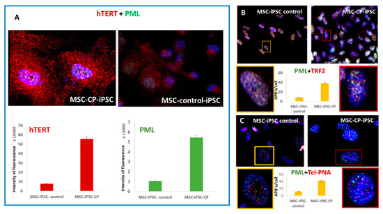 Telomerase and ALT pathway in MSCs derived from CP and control iPSCs. (A) Significantly higher expression of hTERT (red signal) and ALT proteins (green signal) in MSC-CP-iPSCs compared to MSC-control-iPSCs. (B) Colocalization of PML bodies and TRF2 protein (red signal) in MSC-CP-iPSCs. (C) Similarly, APBs were largely observed after immunofluorescence staining of PML and PNA telomere FISH staining (red signal) (IF-FISH) in only MSC-CP-iPSCs compared to MSC-control-iPSCs (63× magnification).