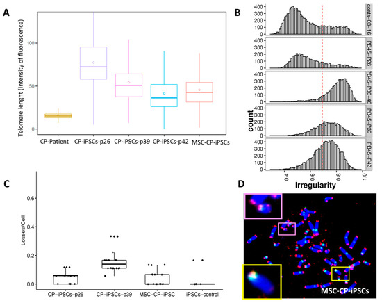 Nevertheless, enhanced telomere shortening following multiple passages was more pronounced in CP-iPSCs compared to iPSCs from healthy donors and associated with an increase in telomere length heterogeneity. In late passages, telomere aberrations were also associated with irregular changes of nuclear morphology. These events led to the progression of telomere dysfunction after the reprogramming of iPSCs cells. Interestingly, telomere dysfunction was more pronounced in derivative cells such as mesenchymal stem cells.