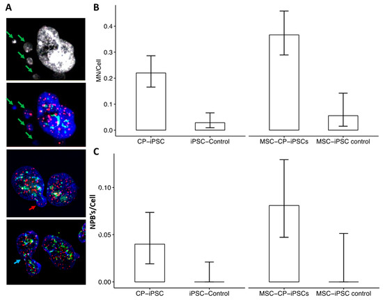 These markers of double-strand breaks and activation of the DNA repair machinery were associated with a higher frequency of micronucleus formation (Figure 6A) and anaphase bridges in CP-iPSCs and in their derived cells than in cells of healthy donors. Moreover, these aberrations could be related to the presence of dicentric chromosomes, a driving force of chromosomal instability in CP-iPSCs (Figure 6A,B).