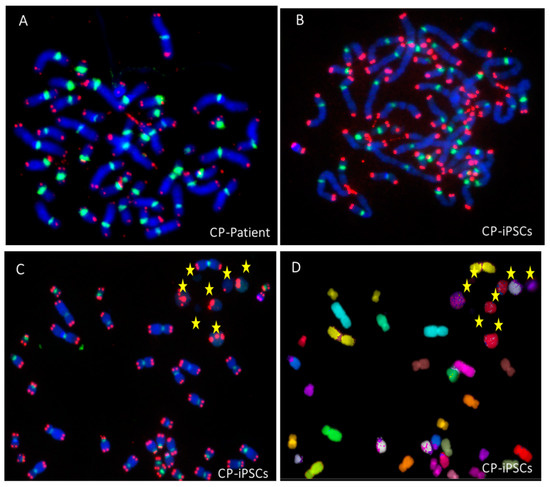 To further determine the telomere phenotype of CP-iPSCs, we examined telomere aberrations, i.e., signs of telomere instability such as sister telomere loss or terminal deletion of telomeres on both sister chromatids of the p or q arms (Figure 4C). Analysis of telomeric FISH signals on metaphase spreads revealed a significantly high rate of telomere loss and deletions in CP-iPSCs and in MSC-CP-iPSCs compared to iPSCs derived from healthy donors (Figure 4C).