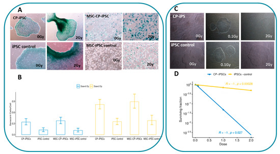 Next, we studied the radiation sensitivity of CP cells. The surviving fraction of irradiated cells after exposure to different doses of irradiation was analyzed. CP-iPSCs did not proliferate after 1 Gy (Figure 9B), and no surviving fraction was observed at 2 Gy (SF2~0).