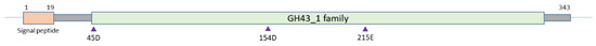 Schematic representation of the domain structure of FcAraf43. A predicted signal peptide in the first 19 amino acids is represented by a pink colored box. The green colored box represents the conserved region characteristic for the CAZy GH43 family 1 (α-L–arabinofuranosidase enzymes). The purple triangles indicate the locations of residues that constitute the active catalytic site of the enzyme.