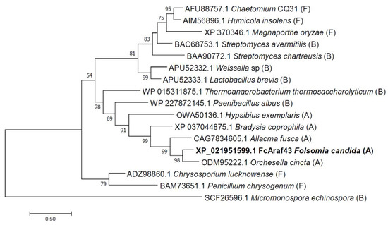 Phylogenetic relation of FcAraf43. An elaborate set of 16 animal, fungal and bacterial peptides from classified CAZy family 43 enzymes were aligned along with FcAraf43. The presented phylogeny is based on maximum likelihood using WAG+G evolutionary model; the outgroup is set at Micromonospora. The numbers next to branches show the percentage bootstrap support based on 1000 replicates. GenBank accession numbers of the annotated CAZy genes are given in front of species names. Branch lengths are measured as the number of substitutions per position/site, with the scale bar representing the length for 0.5 substitutions. Letters in brackets indicate phylum: A, Animal; B, Bacterial, F, Fungal.