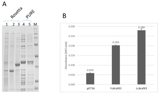 Expression and enzyme activity of FcAraf43. (A) Coomassie-stained SDS-PAGE gel of expression of the processed form of mFcAraf43 and the L. lactis-derived LcAraf43 control with known furanosidase activity expressed in the cell-free PURE system (lanes 4 and 5) and the full-length form of pET16b, FcAraf43 and LcAraf43 (lanes 1–3) in Rosetta (DE3). Lane 1: Negative control empty pET16 vector, Lane 2: Cell culture of FcAraf43 in BL21, Lane 3: Positive control cell culture of BL21-LcAraf43, Lane 4: FcAraf43 in PURE system, Lane 5: LcAraf43 expressed using PURE cell-free system and molecular weight standard. (B) Enzymatic activity of the proteins expressed in the PURE systems, including an empty vector control. The samples were incubated at 37 °C for 16 h and then measured at 405 nm to detect the amount of pNP. The bars represent the mean of three replicates, and the standard deviation is indicated by the error bars.