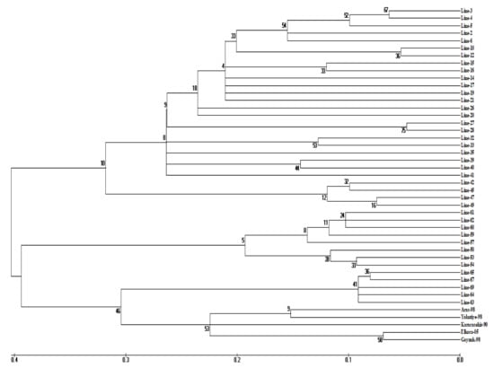Knowing the genetic distances between genotypes provides an enormous advantage in selecting suitable parents for bean breeding programs. In this study, the greatest genetic distance (0.83) was determined between the Karacaşehir-90 variety and Ispir bean lines 49, 50, and 53. The shortest genetic distance was observed between lines 6 and 26 and lines 27 and 28 (0.08 and 0.09, respectively) (Table S1).