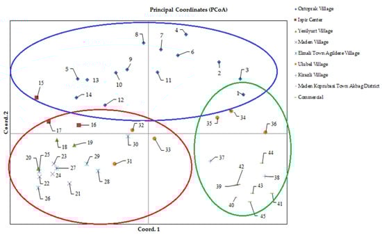Principal coordinate analysis (PCoA) is a multivariate dataset that provides the ability to find and archive key patterns in multiple loci and multiple samples. With this technique, the distances between the groups, which are based on the two-dimensional diagram formed by the similarity or distance matrix between the individuals, reflect actual distances [59]. PCoA is used to provide a spatial representation of the relative genetic distances between populations [60].