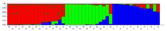 Graphic representation of population structure according to SSR data [For each bean genotype, subgroup 1 (red), subgroup 2 (green), and subgroup 3 (blue) are indicated by a vertical line representing the genotypes (K = 3)].