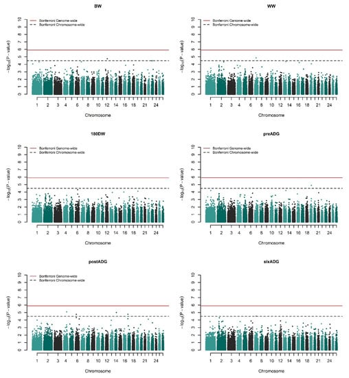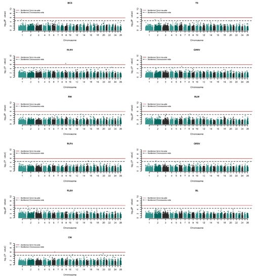 Quantile–Quantile (Q–Q) plots were used to inspect the inflation of the test statistics due to any possible systematic bias or error, considering the p-value distribution under the null hypothesis of ‘no association’ (see Supplementary Figure S1). Furthermore, a genomic control method was used to adjust and remove any possible inflation in the test statistics by setting λ to 1 [40]. SNP effects were visualized as −log10 (p-value) and are represented on Manhattan plots of each trait, with consideration being given to the relevant chromosome. Two significant thresholds were applied to the SNPs to identify genome- and chromosome-wide significance based on p-values. To avoid increased false positives imposed by multiple testing, Bonferroni correction was utilized to assign both genome- and chromosome-wide significance thresholds, where the representative significance level of 0.05 was first divided by the total number of SNPs which passed QC for genome-wide significance. Later, the representative significance level was divided by the average number of SNPs per chromosome to assess for chromosome-wide significance. Thus, the obtained genome-wide significance threshold was 1.236 × 10−6 and the chromosome-wide was 3.214 × 10−5, respectively leading to 5.90 and 4.49 on the −log10 (p-value) scale of the Manhattan plots.