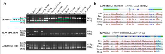 RIP identification and insertion loci diagram in LEPROT and LEPR. (A) The electrophoretogram of PCR production of three loci in LEPROT and LEPR genes in 12 breeds or population DNA pool. (B) Insertion loci diagram and sequence alignment for different species in LEPROT and LEPR.