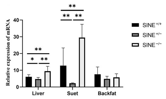 Tissue samples including liver, suet, and backfat from four 30-day-old piglets for each genotype (SINE+/+, SINE+/−, and SINE−/−) were prepared. The mRNA was extracted using Trizol (Invitrogen, Shanghai, China), and 1000 ng RNA was reverse-transcribed into cDNAs using a TAKARA Kit (Takara, Tokyo, Japan). Then, quantitative real-time PCR (qPCR) was performed using the 7900HT Fast Real-Time PCR System (Applied Biosystems, New York, NY, USA) in a total volume of 20 μL containing SYBR mix (10 μL) (Takara, Tokyo, Japan), primers (4 ng), and cDNA sample (50 ng). Gene expression was normalized to glyceraldehyde-3-phosphate dehydrogenase (GAPDH) and measured using the 2− ΔΔCt method. The primer sequences also are shown in Table S1.