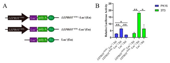 The promoter of LEPROT was predicted (version Promoter 2.0, https://services.healthtech.dtu.dk/service.php?Promoter-2.0, accessed on 25 September 2020), and one predicted region of Leprot with (852 bp) and without the SINE insertion allele (566 bp) was cloned from the Sujiang genomic DNA and verified by sequencing. The primers are listed in Table S2. Then, the 852 bp and 566 bp sequences were inserted into the pGL3-basic vectors (Promega, Madison, WI, USA) to construct LEPROTSINE+-Luc+(En) vector and LEPROTSINE—Luc+ (En) vector, which contain β-globin and Oct4 mini promoters, respectively, for enhancer/repressor activity evaluation [32,35]. In 24-well plates, PK15 and 3T3-L1 cells were cultured to approximately 70% confluence and transfected with the luciferase reporter vector using the Lipofectamine 3000 reagent (Invitrogen, Carlsbad, CA, USA). After 48 h, luciferase activity was evaluated using the dual-luciferase reporter system (Promega, Madison, WI, USA) according to the manufacturer’s protocol.