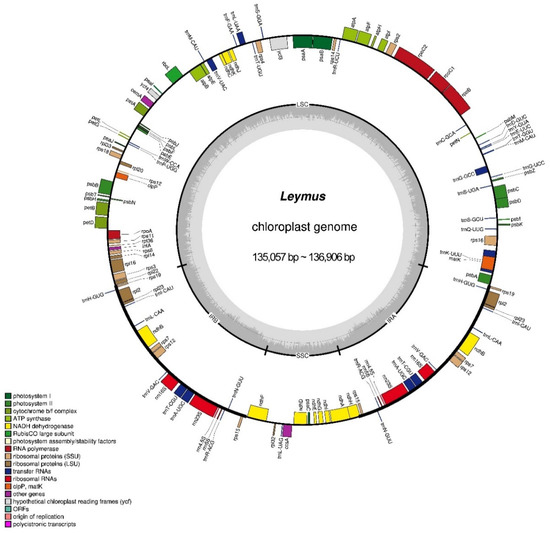 Chloroplasts (cp) are important semi-autonomous genetic organelles for the process of photosynthesis and carbon fixation [17,18]. The complete cp genome of most angiosperms has typically conserved quadripartite structures with a large single-copy (LSC) region, a small single-copy (SSC) region, and two copies of inverted repeat (IR) regions [18,19,20]. Few plants, such as some Leguminosae species, have cp genomes that are not the typical quadripartite structure owing to the loss of a reverse repetitive sequence [21]. CpDNA is predominantly inherited from the maternal parent; however, exceptions can be observed even though it rarely happens. The highly conserved cp genome can provide more reliable data for phylogenetic studies and is the optimal material for phylogeographic, system taxonomic, phylogenetic, and molecular evolution investigations [22]. To date, complete cp genomes are available for more than 100 Triticodae species, including five Leymus species. According to the evolutionary patterns of the cp genomes among 131 Triticodae species, L. arenarius (MK775256), L. chinensis (MK775258), and L. triticoides (NC_058745), Psathyrostachys species are believed to be closely related to the Eurasia Leymus species [23]. Although the cp genome is very significant, the number of published whole cp genome sequences of the Leymus species is still limited. Furthermore, some sequenced Leymus cp genomes have not been comprehensively and systemically studied.