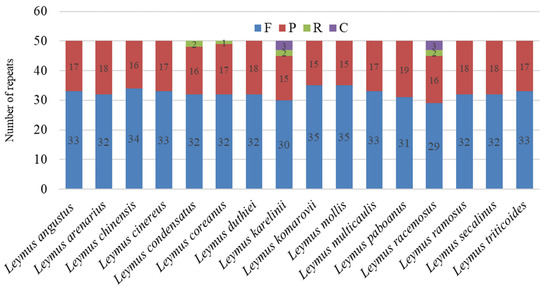 The number of the four types of repeats identified in the 16 Leymus cp genomes. F, P, R, and C represent forward, palindromic, reverse, and complementary repeats, respectively.