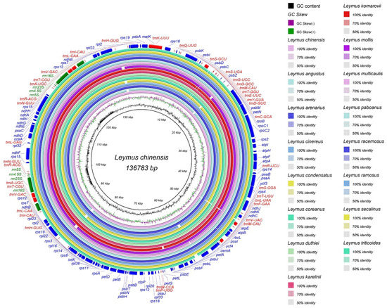 The cp genomes of the Leymus species had the typical quadripartite structure, with the length of the LSC, SSC, and IR regions ranging between 80,149 bp in L. triticoides and 81,053 bp in L. paboanus, 12,708 bp in L. karelinii and 12,797 bp in L. duthiei, and 20,813 bp in L. angustus and 21,578 bp in L. komarovii, respectively (Table S1). The size of the 16 Leymus cp genomes ranged from 135,057 bp of L. condensatus and 136,906 bp of L. coreanus (Figure 1, Table S1) and comprised 129 genes, including 83 protein-coding genes, 38 transfer RNA (tRNA) genes, and 8 ribosomal RNA (rRNA) genes (Table 1 and Table S2). Among these genes, six protein-coding genes, four rRNAs, and nine tRNA were the same in the two identified IR regions; in other words, these 19 genes were duplicated in the two IR regions. The LSC region contained 62 protein-coding genes and 20 tRNA genes, whereas 11 protein-coding genes and one tRNA gene were located in the SSC regions. Among all genes, seven protein-coding genes and six tRNAs were within one intron; additionally, two protein-coding genes (rps12 and ycf3) were within two introns (Tables S2 and S3). In particular, rps12 was trans-spliced, with the 5′-end–exon being located in the LSC region, and two 3′-end–exons being both in the IRs. The GC content of the cp genomes ranged from 38.33–38.42%, which was almost identical to that of all other Leymus species (Table S2), with the IR regions having the highest GC content (43.89–44.01%), followed by the LSC (36.35–36.41%) and SSC regions (32.23–32.63%). Noteworthily, the two IR regions had the same GC content (Table S2).