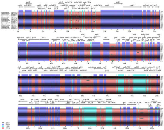 Global alignment of the cp genome sequences of the Leymus species using L. chinensis as reference. The value of the vertical scale (from 50% to 100%) represents the percentage of identity. Arrows indicate the annotated genes and their transcriptional direction. Different colored boxes represent exons, transfer RNA, ribosomal RNA, and non-coding sequences (CNSs).