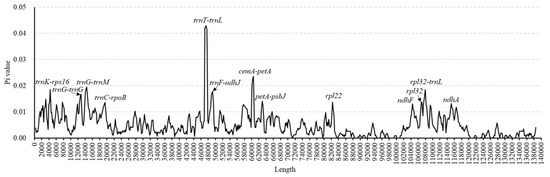 Nucleotide diversity (Pi) was determined by sliding window analysis of the aligned whole cp genomes of the 16 Leymus species (window length: 600 bp; step size: 200 bp). The X-axis represents the position of the midpoint of the window and the Y-axis represents the Pi of each window.