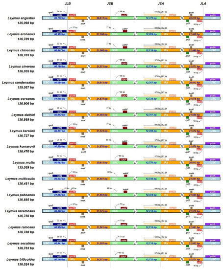 Comparison of the borders of the large single-copy (LSC), inverted repeat (IR), and small single-copy (SSC) junction boundaries in the cp genomes of the 16 Leymus species. JLB, JSB, JSA, and JLA represent the LSC/Irb, SSC/Irb, SSC/Ira, and LSC/Ira junction regions, respectively.