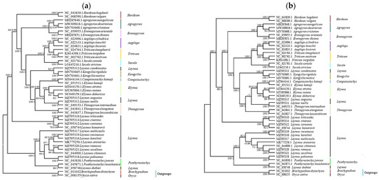 Phylogenetic tree of the Leymus species. Brachypodium distachyon and Oryza sativa Indica were selected as the outgroups. The tree was constructed by maximum likelihood and Bayesian inference with bootstrap values or posterior probabilities being indicated above the branches. The bootstrap values or posterior probabilities no more than 50% or 0.5 were shown in “-”. (a) Based on complete cp genome data; (b) based on 74 shared protein-coding genes.