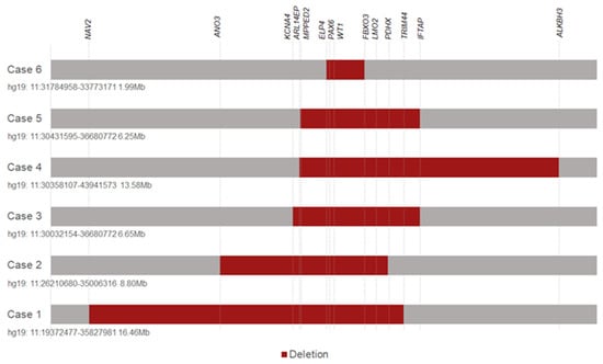 The deletion of chromosome 11p13 involving the WT1 and the PAX6 genes has been shown to cause WAGR syndrome [6]. The increased risks for Wilms tumor and genitourinary anomalies in WAGR patients are attributed to the deletion of WT1. Aniridia and associated ocular defects are triggered by a PAX6 haploinsufficiency that encodes a transcriptional regulator required for the eye development [6]. Furthermore, brain-derived neurotrophic factor (BDNF, OMIM #113505) has been proven to be associated with intellectual disability, autism, and childhood-onset obesity in subjects with WAGR [4,7]. Theoretically, the severity of the phenotype depends on the size of the deletion. A deletion map of the WAGR region, ranging from 11p14 to 11p11 [1,8], can be found in earlier studies [1,9]. However, the relationship between the clinical phenotypes and genotypes of WAGR is not fully understood. Patients with a similar deletion region may present with different phenotypes and vice versa [9].