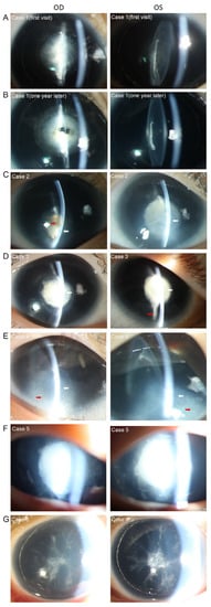 Anterior segment photographs of 6 patients with WAGR syndrome. (A). Anterior segment of case 1 at her first visit. (B). Anterior segment of case 1 one year later. (C). Anterior segment of case 2 showing keratolenticular adhesion, corneal neovascularization, aniridia, and cataract. (D). Anterior segment of case 3 showing keratolenticular adhesion, corneal neovascularization, aniridia, and the thin lens with cataract. (E). Anterior segment of case 4 showing keratolenticular adhesion, corneal neovascularization, aniridia, and the cataract. (F). Anterior segment of case 5 showing nuclear cataracts and aniridia. (G). Anterior segment of case 6 showing subcapsular cataract and aniridia. (White arrow: keratolenticular adhesion; red arrow: corneal neovascularization.).