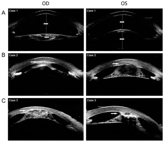 Ultrasound biomicroscopy of 3 patients with WAGR syndrome. (A). Anterior segment of case 1 showing the thin lens of the right eye and aniridia of both eyes. (B). Anterior segment of case 2 showing keratolenticular adhesion, aniridia, and thin lens. (C). Anterior segment of case 3 showing keratolenticular adhesion, aniridia, and thin lens. (White arrow: keratolenticular adhesion).