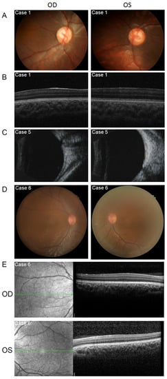 Ocular features of the patients with WAGR syndrome. (A). Fundus photograph of case 1 showing increased cup-to-disc ratio in both eyes. (B). OCT images of case 1 showing macular hypoplasia in both eyes. (C). B-scan images of case 5 showing increased cup-to-disc ratio in both eyes. (D). Fundus photograph of case 6 showing macular hypoplasia of both eyes. (E). OCT images of case 6 showing macular hypoplasia in both eyes.